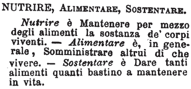 Nutrire, Alimentare, Sostentare - Nutrire è Mantenere per mezzo degli alimenti la sostanza de' corpi viventi. - Alimentare è, in generale, Somministrare altrui di che vivere. - Sostentare è Dare tanti alimenti quanti bastino a mantenere in vita. [immagine]