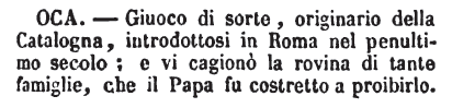 Oca - OCA. - Giuoco di sorte, originario della Catalogna, introdottosi in Roma nel penultimo secolo; e vi cagionò la rovina di tante famiglie, che il Papa fu costretto a proibirlo. [immagine]