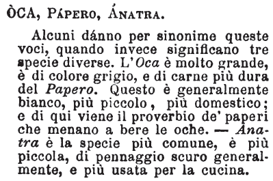 Oca, Papero, Anatra - Alcuni dànno per sinonime queste voci, quando invece significano tre specie diverse. L'Oca è molto grande, è di colore grigio, e di carne più dura del Papero. Questo è generalmente bianco, più piccolo, più domestico; e di qui viene il proverbio de' paperi che menano a bere le oche. - Anatra è la specie più comune, è più piccola, di pennaggio scuro generalmente, e più usata per la cucina. [immagine]