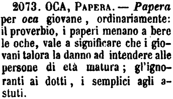 Oca, Papera - Papera per oca giovane, ordinariamente: il proverbio, i paperi menano a bere le oche, vale a significare che i giovani talora la danno ad intendere alle persone di età matura; gl'ignoranti ai dotti, i semplici agli astuti. [immagine]