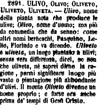 Ulivo, Olivo; Oliveto, Uliveto, Uliveta - Ulivo, nome della pianta nota che produce le ulive; Olivo, nome d'uomo; ma più da commedia che da senno: come altri nomi berneschi, Pasquìno, Lelio, Florindo e va dicendo. Uliveto e uliveta, un luogo piantato a ulivi; senza vera differenza, direi, se non che uliveta, nè saprei dirne la ragione, parmi significare luogo più vasto o piantagione più abbondante d'ulivi. Il monte Oliveto divenne un nome proprio; e forse era anche prima de' tempi di Gesù Cristo. [immagine]