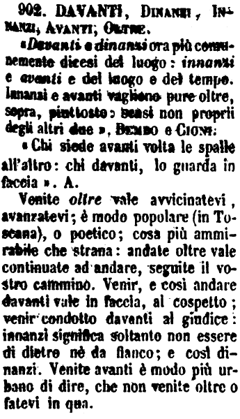 Davanti, Dinanzi, Innanzi, Avanti, Oltre - « Davanti e dinanzi ora più comunemente dicesi del luogo: innanzi e avanti e del luogo e del tempo. Innanzi e avanti vagliono pure oltre, sopra, piuttosto: bensì non proprii degli altri due ». Bembo e Cioni.