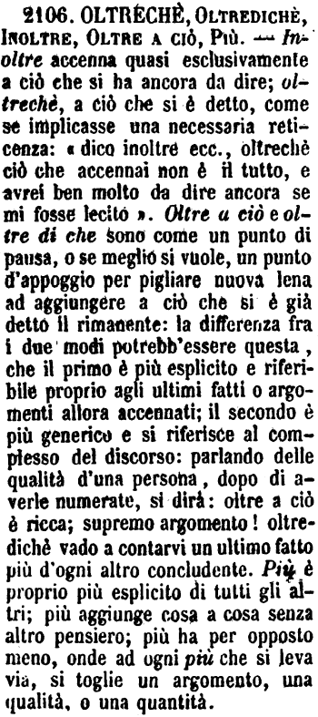 | Oltrechè, Oltredichè, Inoltre, Oltre a ciò, Più - Inoltre accenna quasi esclusivamente a ciò che si ha ancora da dire; oltrechè, a ciò che si è detto, come se implicasse una necessaria reticenza: «dico inoltre ecc., oltrechè ciò che accennai non è il tutto, e avrei ben molto da dire ancora se mi fosse lecito». Oltre a ciò e oltre di che sono come un punto di pausa, o se meglio si vuole, un punto d'appoggio per pigliare nuova lena ad aggiungere a ciò che si è già detto il rimanente: la differenza fra i due modi potrebb'essere questa, che il primo è più esplicito e riferibile proprio agli ultimi fatti o argomenti allora accennati; il secondo è più generico e si riferisce al complesso del discorso: parlando delle qualità d'una persona, dopo di averle numerate, si dirà: oltre a ciò è ricca; supremo argomento! oltredichè vado a contarvi un ultimo fatto più d'ogni altro concludente. Più è proprio più esplicito di tutti gli altri; più aggiunge cosa a cosa senza altro pensiero; più ha per opposto meno, onde ad ogni più che si leva via, si toglie un argomento, una qualità, o una quantità. [immagine] |