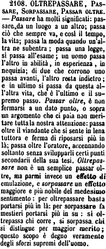 Oltrepassare, Passare, Sorpassare, Passar oltre - Passare ha molti significati: passare da un luogo a un altro; passa ciò che sempre va, e così il tempo, la vita; passa la moda quando un'altra ne subentra; passa una legge, si passa all'esame; un uomo passa l'altro in abilità, in esperienza, in nequizia; di due che corrono uno passa avanti, l'altro resta indietro; e in ultimo si passa da questa all'altra vita, che è l'ultimo e il supremo passo. Passar oltre, è non fermarsi a un dato punto, o sopra un argomento che ci paia non meritare tutta la nostra attenzione: passa oltre il viandante che si sente in lena tuttora e ferma di riposarsi più in là; passa oltre l'oratore, accennando soltanto senza svilupparli certi punti secondarii della sua tesi. Oltrepassare non è un semplice passar oltre, ma parmi invece un effetto di emulazione, e sorpassare un effetto maggiore e più nobile del medesimo sentimento: per oltrepassare basta portarsi più in là: per sorpassare fa mestieri portarsi più in su: si oltrepassa chi corre, si sorpassa chi si distingue per maggior merito; questo scopo è degno veramente degli sforzi supremi dell'uomo. [immagine]