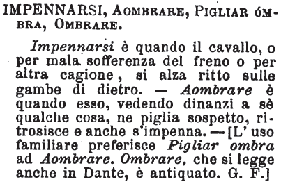 | Impennarsi, Aombrare, Pigliar ombra, Ombrare - Impennarsi è quando il cavallo, o per mala sofferenza del freno o per altra cagione, si alza ritto sulle gambe di dietro. - Aombrare è quando esso, vedendo dinanzi a sé qualche cosa, ne piglia sospetto, ritrosisce e anche s'impenna.-[L'uso familiare preferisce Pigliar ombra ad Aombrare. Ombrare, che si legge anche in Dante, è antiquato. G.F.] [immagine] |