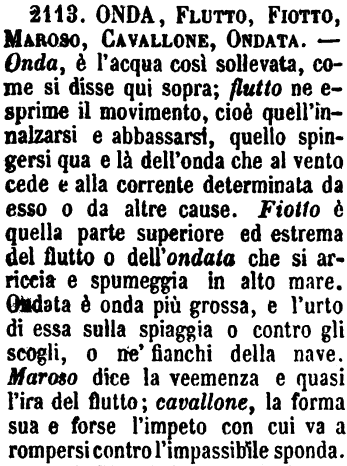 | Onda, Flutto, Fiotto, Maroso, Cavallone, Ondata - Onda, è l'acqua così sollevata, come si disse qui sopra; flutto ne esprime il movimento, cioè quell'innalzarsi e abbassarsi, quello spingersi qua e là dell'onda che al vento cede e alla corrente determinata da esso o da altre cause. Fiotto è quella parte superiore ed estrema del flutto o dell'ondata che si arriccia e spumeggia in alto mare. Ondata è onda più grossa, e l'urto di essa sulla spiaggia o contro gli scogli, o ne' fianchi della nave. Maroso dice la veemenza e quasi l'ira del flutto; cavallone, la forma sua e forse l'impeto con cui va a rompersi contro l'impassibile sponda. [immagine] |