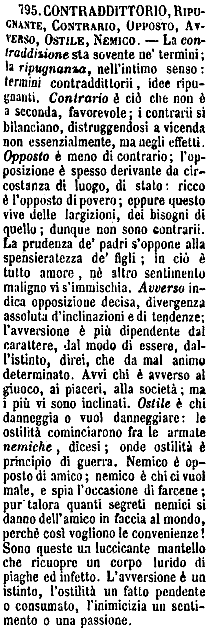 | Contraddittorio, Ripugnante, Contrario, Opposto, Avverso, Ostile, Nemico - La contraddizione sta sovente ne' termini; la ripugnanza, nell'intimo senso: termini contraddittorii, idee ripugnanti. Contrario è ciò che non è a seconda, favorevole; i contrarii si bilanciano, distruggendosi a vicenda non essenzialmente, ma negli effetti. Opposto è meno di contrario; l'opposizione è spesso derivante da circostanza di luogo, di stato: ricco è l'opposto di povero; eppure questo vive delle largizioni, dei bisogni di quello; dunque non sono contrarii. La prudenza de' padri s'oppone alla spensieratezza de' figli; in ciò è tutto amore, nè altro sentimento maligno vi s'immischia. Avverso indica opposizione decisa, divergenza assoluta d'inclinazioni e di tendenze; l'avversione è più dipendente dal carattere, dal modo di essere, dall'istinto, direi, che da mal animo determinato. Avvi chi è avverso al giuoco, ai piaceri, alla società; ma i più vi sono inclinati. Ostile è chi danneggia o vuol danneggiare: le ostilità cominciarono fra le armate nemiche, dicesi; onde ostilità è principio di guerra. Nemico è opposto di amico; nemico è chi ci vuol male, e spia l'occasione di farcene; pur talora quanti segreti nemici si danno dell'amico in faccia al mondo, perchè così vogliono le convenienze! Sono queste un luccicante mantello che ricuopre un corpo lurido di piaghe ed infetto. L'avversione è un istinto, l'ostilità un fatto pendente o consumato, l'inimicizia un sentimento o una passione. [immagine] |