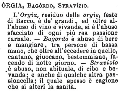 | Orgia, Bagordo, Stravizio - L'Orgia, residuo delle orgie, feste di Bacco, è de' grandi, ed oltre all'abuso di vino e vivande, si è l'abuso sfacciato di ogni più rea passione carnale. - Bagordo è abuso di bere e mangiare, tra persone di bassa mano, che oltre all'eccedere in quello, cantano, giuocano, bestemmiano, facendo di notte giorno. - Stravizio è abuso, non abituale, di cibo e bevanda; e anche di qualche altra passioncella; il quale spesso è cagione che si alteri la sanità. [immagine] |