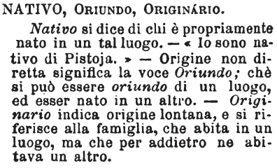 | Nativo, Oriundo, Originario - Nativo si dice di chi è propriamente nato in un tal luogo. - « Io sono nativo di Pistoja. » - Origine non diretta significa la voce Oriundo; chè si può essere oriundo di un luogo ed esser nato in un altro. - Originario indica origine lontana, e si riferisce alla famiglia, che abita in un luogo, ma che per addietro ne abitava un altro. [immagine] |