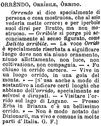 Orrendo, Orribile, Orrido - Orrendo si dice specialmente di persona o cosa mostruosa, che al solo vederla mette orrore; e per iperbole suol dirsi per Brutto, ma non mostruoso. - Orribile si porge più acconciamente al senso figurato, come Delitto orribile. - La voce Orrido é specialmente riserbata a significare luogo dove non sia niuno ornamento, niuno allettamento, non luce, non coltivazione, non compagnia. - «Fu chiuso in orrido carcere. - Vive in un luogo orrido, in una gola del monte.» [S'usa anche a modo di sostantivo a indicare certi luoghi che abbiano dell'orrido, specialmente se selvosi e dirupati. - «Visitare l'orrido sul lago di Lugano. - Presso Erba in Brianza c'è un bellissimo orrido.» - Non è modo notato dai Dizionarii, ma vivo e comune in molte parti d'Italia. G. F.] [immagine]