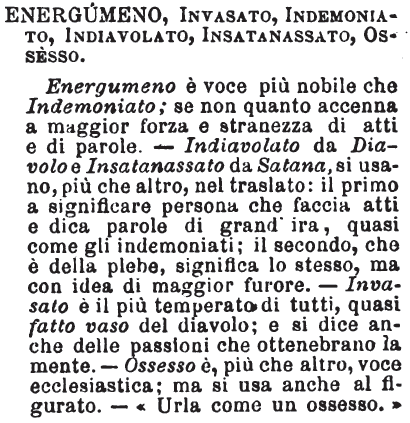 | Energumeno, Invasato, Indemoniato, Indiavolato, Insatanassato, Ossesso - Energumeno è voce più nobile che Indemoniato; se non quanto accenna a maggior forza e stranezza di atti e di parole. - Indiavolato da Diavolo e Insatanassato da Satana, si usano, più che altro, nel traslato: il primo a significare persona che faccia atti e dica parole di grand'ira, quasi come gli indemoniati; il secondo, che è della plebe, significa lo stesso, ma con idea di maggior furore. - Invasato è il più temperato di tutti, quasi fatto vaso del diavolo; e si dice anche delle passioni che ottenebrano la mente. - Ossesso è, più che altro, voce ecclesiastica; ma si usa anche al figurato. - «Urla come un ossesso.» [immagine] |