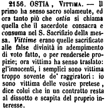 Ostia, Vittima - Il primo ha senso sacro solamente, ed ora tanto più che ostia si chiama quella che il sacerdote consacra e consuma nel S.Sacrifizio della messa. Vittime erano quelle sacrificate alle false divinità in adempimento di voto fatto, o per rendersele propizie; ora vittima ha senso traslato: gl'innocenti, i semplici sono vittima troppo sovente de' raggiratori: io sono vittima delle vostre pretese, dice colui che in un contratto resta al dissotto e scapita del proprio interesse. [immagine]