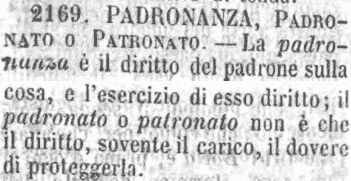 | Padronanza, Padronato o Patronato - La padronanza è il diritto del padrone sulla cosa, e l'esercizio di esso diritto; il padronato o patronato non è che il diritto, sovente il carico, il dovere di proteggerla. [immagine] |