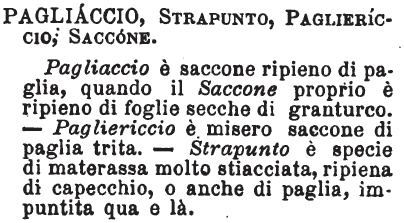 Pagliericcio è misero saccone di paglia trita. Strapunto è specie di materassa molto stiacciata, ripiena di capecchio, o anche di paglia, impuntita qua e là. [immagine] |