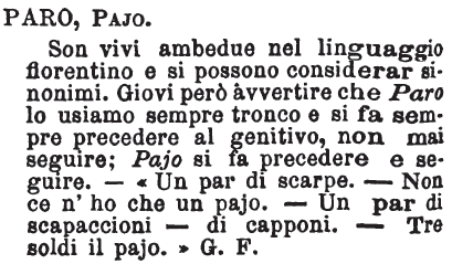 | Paro, Pajo - Son vivi ambedue nel linguaggio fiorentino e si possono considerar sinonimi. Giovi però avvertire che Paro lo usiamo sempre tronco e si fa sempre precedere al genitivo, non mai seguire; Pajo si fa precedere e seguire. - «Un par di scarpe. - Non ce n'ho che un pajo. - Un par di scapaccioni - di capponi. - Tre soldi il pajo.» G. F. [immagine] |