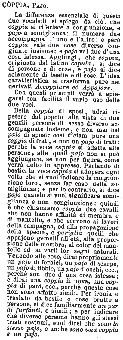 | Coppia, Pajo - La differenza essenziale di questi due vocaboli si spiega da ciò, che coppia si riferisce a congiunzione, e pajo a somiglianza; il numero due accompagna l'uno e l'altro: e però coppia vale due cose diverse congiunte insieme; e pajo val due d'una cosa istessa. Aggiungi, che coppia, originata dal latino copula, si dice di persone e di cose, e pajo si dice solamente di bestie e di cose. L'idea caratteristica si trasforma pure nei derivati Accoppiare ed Appajare.
