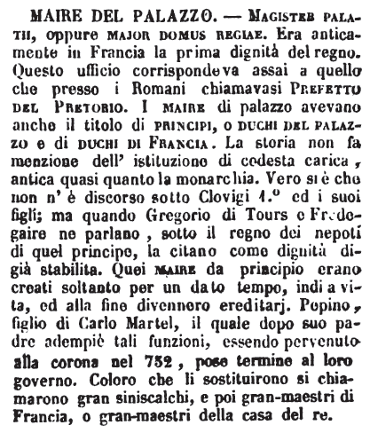 | Maire del palazzo - Magister palatii, oppure major domus regiae. Era anticamente in Francia la prima dignità del regno. Questo ufficio corrispondeva assai a quello che presso i Romani chiamavasi Prefetto del pretorio. I maire di palazzo avevano anche il titolo di principi, o duchi del palazzo e di duchi di Francia. La storia non fa menzione dell'istituzione di codesta carica, antica quasi quanto la monarchia. Vero si è che non n'è discorso sotto Clovigi 1.° ed i suoi figli; ma quando Gregorio di Tours e Fredegaire ne parlano, sotto il regno dei nepoti di quel principe, la citano come dignità digià stabilita. Quei maire da principio erano creati soltanto per un dato tempo, indi a vita, ed alla fine divennero ereditarj. Pepino, figlio di Carlo Martel, il quale dopo suo padre adempiè tali funzioni, essendo pervenuto alla corona nel 752, pose termine al loro governo. Coloro che li sostituirono si chiamarono gran siniscalchi, e poi gran-maestri di Francia, o gran-maestri della casa del re. [immagine] |