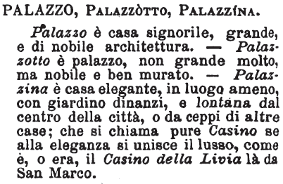| Palazzo, Palazzotto, Palazzina - Palazzo è casa signorile, grande, e di nobile architettura. - Palazzotto è palazzo, non grande molto, ma nobile e ben murato. - Palazzina è casa elegante, in luogo ameno, con giardino dinanzi, e lontana dal centro della città, o da ceppi di altre case; che si chiama pure Casino se alla eleganza si unisce il lusso, come è, o era, il Casino della Livia là da San Marco. [immagine] |