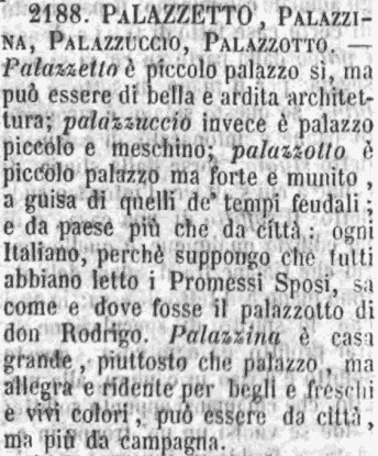 Palazzetto, Palazzina, Palazzuccio, Palazzotto - Palazzetto è piccolo palazzo sì, ma può essere di bella e ardita architettura; palazzuccio invece è palazzo piccolo e meschino; palazzotto è piccolo palazzo ma forte e munito, a guisa di quelli de' tempi feudali; e da paese più che da città: ogni Italiano, perchè suppongo che tutti abbiano letto i Promessi Sposi, sa come e dove fosse il palazzotto di don Rodrigo. Palazzina è casa grande, piuttosto che palazzo, ma allegra e ridente per begli e freschi e vivi colori, può essere da città, ma più da campagna. [immagine]