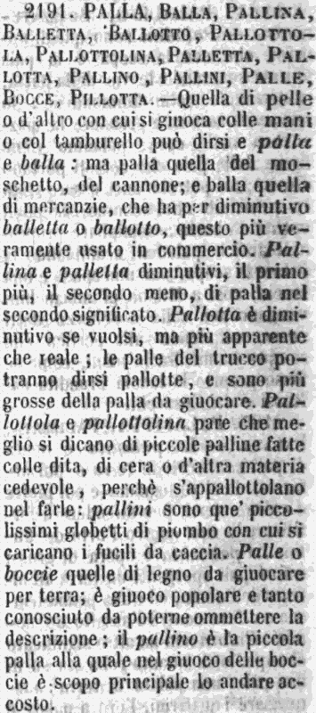 | Palla, Balla, Pallina, Balletta, Ballotto, Pallottola, Pallottolina, Palletta, Pallotta, Pallino, Pallini, Palle, Bocce, Pillotta - Quella di pelle o d'altro con cui si giuoca colle mani o col tamburello può dirsi e palla e balla: ma palla quella del moschetto, del cannone; e balla quella di mercanzie, che ha per diminutivo balletta o ballotto, questo più veramente usato in commercio. Pallina e palletta diminutivi, il primo più, il secondo meno, di palla nel secondo significato. Pallotta è diminutivo se vuolsi, ma più apparente che reale; le palle del trucco potranno dirsi pallotte, e sono più grosse della palla da giuocare. Pallottola e pallottolina pare che meglio si dicano di piccole palline fatte colle dita, di cera o d'altra materia cedevole, perchè s'appallottolano nel farle: pallini sono que' piccolissimi globetti di piombo con cui si caricano i fucili da caccia. Palle o boccie quelle di legno da giuocare per terra; è giuoco popolare e tanto conosciuto da poterne ommettere la descrizione; il pallino è la piccola palla alla quale nel giuoco delle boccie è scopo principale lo andare accosto. [immagine] |