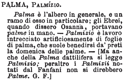 Palma, Palmizio - Palma è l'albero in generale, e un ramo di esso in particolare; gli Ebrei, quando dissero Osanna, portavano palme in mano. - Palmizio è lavoro intrecciato artificiosamente di foglie di palma, che suole benedirsi da' preti la domenica delle palme. - [Ma anche della Palma dattilifera si legge Palmizio; peraltro i Palmizii notati dal Fanfani non si direbbero Palme. G. F.] [immagine]