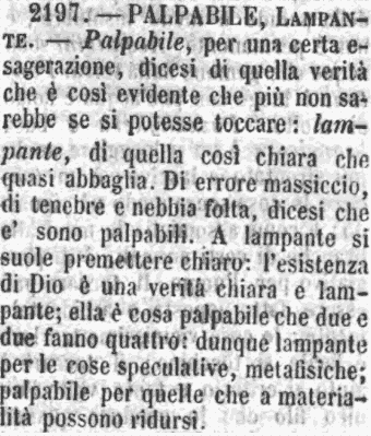 Palpabile, Lampante - Palpabile, per una certa esagerazione, dicesi di quella verità che è così evidente che più non sarebbe se si potesse toccare: lampante, di quella così chiara che quasi abbaglia. Di errore massiccio, di tenebre e nebbia folta, dicesi che e' sono palpabili. A lampante si suole premettere chiaro: l'esistenza di Dio è una verità chiara e lampante; ella è cosa palpabile che due e due fanno quattro: dunque lampante per le cose speculative, metafisiche; palpabile per quelle che a materialità possono ridursi. [immagine]