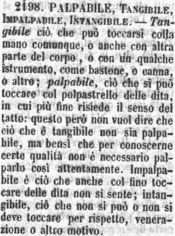 Palpabile, Tangibile, Impalpabile, Intangibile - Tangibile ciò che può toccarsi colla mano comunque, o anche con altra parte del corpo, o con un qualche istrumento, come bastone, o canna, o altro; palpabile, ciò che si può toccare col polpastrello delle dita, in cui più fine risiede il senso del tatto: questo però non vuol dire che ciò che è tangibile non sia palpabile, ma bensì che per conoscerne certe qualità non è necessario palparlo così attentamente. Impalpabile è ciò che anche col fino toccare delle dita non si sente; intangibile, ciò che non si può o non si deve toccare per rispetto, venerazione o altro motivo. [immagine]
