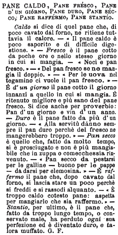 | Pane caldo, Pane fresco, Pane d’un giorno, Pane duro, Pane secco, Pane raffermo, Pane stantio - Caldo si dice di quel pane che, di poco cavato dal forno, ne ritiene tuttavia il calore. - «Il pane caldo è poco saporito e di difficile digestione.» - Fresco è il pane cotto da poche ore o nello stesso giorno in cui si mangia. - «Noci e pan fresco.» - «Del pan fresco se ne mangia il doppio.» - «Per le uova nel tegamino ci vuole il pan fresco.» - E' d'un giorno il pane cotto il giorno innanzi a quello in cui si mangia. E' ritenuto migliore e più sano del pane fresco. Si dice anche per proverbio: Pan d'un giorno e vin d'un anno. - Duro è il pane fatto da più d'un giorno. - «Alla servitù dánno sempre il pan duro perchè del fresco ne mangerebbero troppo.» - Pan secco è quello che, fatto da molto tempo, si è prosciugato e non è più mangiabile che in zuppa o comecchessia rinvenuto. - «Pan secco da pestarsi per le galline - buono per le pappe - da darsi per elemosina.» - E' raffermo il pane che, dopo cavato dal forno, si lascia stare un poco perchè si freddi e si rassodi alquanto. - «E' troppo caldo cotesto pane: aspetta per mangiarlo che sia raffermo.» - Stantio, per ultimo, è il pane che, fatto da troppo lungo tempo, o conservato male, ha perduto ogni sua perfezione ed è diventato duro, e talora muffato. G. F. [immagine] |