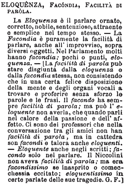 Eloquenza, Facondia, Facilità di parola - La Eloquenza è il parlare ornato, corretto, nobile, sentenzioso, attraente e semplice nel tempo stesso. - La Facondia è puramente la facilità di parlare, anche all'improvviso, sopra diversi oggetti. Nel Parlamento molti hanno facondia; pochi o punti, eloquenza. - [La facilità di parola può stare disgiunta dalla eloquenza e dalla facondia stessa, non consistendo che in una certa felice disposizione della mente e degli organi vocali a trovare e proferire senza sforzo le parole e le frasi. Il facondo ha sempre facilità di parola; ma può l'eloquente non averla, che quando parli nel calore della passione e dell'affetto. Ci sono dei professori che nella conversazione tra amici non han facilità di parola, ma in cattedra son facondi e talora anche eloquenti. - Eloquente anche negli scritti; facondo solo nel parlare. Il Niccolini non aveva facilità di parola; ma era facondissimo se inasprito o comecchessia eccitato; eloquentissimo in certe parlate delle sue tragedie. G. F.] [immagine]