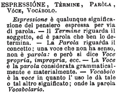 Espressione, Termine, Parola, Voce, Vocabolo - Espressione è qualunque significazione del pensiero espressa per via di parola. - Il Termine riguarda il soggetto, ed è parola che ben lo determina. - La Parola riguarda il concetto; una voce che non ha senso, non è parola: e però si dice Voce propria, impropria, ecc. - La Voce è la parola considerata grammaticalmente e materialmente. - Vocabolo è la voce in quanto l'uso le dà tale o tal altro significato; onde la parola Vocabolario. [immagine]