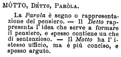 Motto, Detto, Parola - La Parola è segno o rappresentazione del pensiero. - Il Detto rappresenta l'idea che serve a formare il pensiero, e spesso contiene un che di sentenzioso. - Il Motto ha l'istesso ufficio, ma è più conciso, e spesso arguto. [immagine]