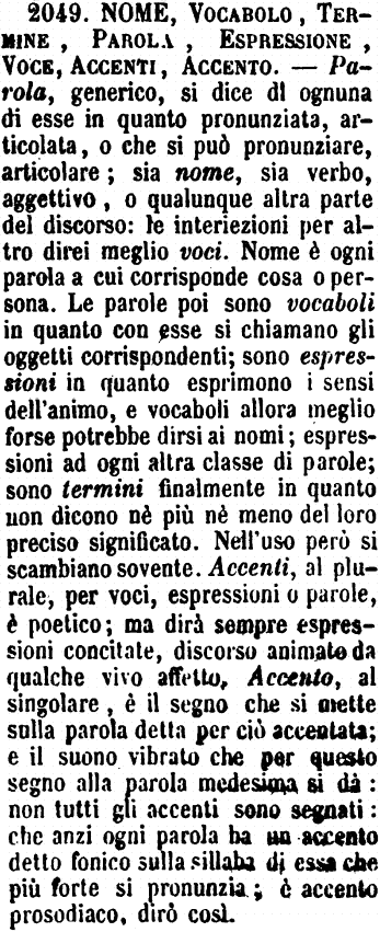 Nome, Vocabolo, Termine, Parola, Espressione, Voce, Accenti, Accento - Parola, generico, si dice di ognuna di esse in quanto pronunziata, articolata, o che si può pronunziare, articolare; sia nome, sia verbo, aggettivo, o qualunque altra parte del discorso: le interiezioni per altro direi meglio voci. Nome è ogni parola a cui corrisponde cosa o persona. Le parole poi sono vocaboli in quanto con esse si chiamano gli oggetti corrispondenti; sono espressioni in quanto esprimono i sensi dell'animo, e vocaboli allora meglio forse potrebbe dirsi ai nomi; espressioni ad ogni altra classe di parole; sono termini finalmente in quanto non dicono né più né meno del loro preciso significato. Nell'uso però si scambiano sovente. Accenti, al plurale, per voci, espressioni o parole, è poetico; ma dirà sempre espressioni concitate, discorso animato da qualche vivo affetto. Accento, al singolare, è il segno che si mette sulla parola detta per ciò accentata; e il suono vibrato che per questo segno alla parola medesima si dà: non tutti gli accenti sono segnati: che anzi ogni parola ha un accento detto fonico sulla sillaba di essa che più forte si pronunzia; è accento prosodiaco, dirò così. [immagine]