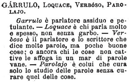 Garrulo, Loquace, Verboso, Parolajo - Garrulo è parlatore assiduo e petulante. - Loquace è chi parla molto e spesso, non senza garbo. - Verboso è il parlatore e lo scrittore che dice molte parole, ma poche buone cose; o ancora chi le cose non cattive le affoga in un mar di parole vane. - Parolajo è colui che cura solo lo studio delle parole senza curare quel delle cose. [immagine]