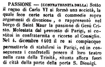 | Passione (Confraternita della) - Sotto il regno di Carlo VI si formò una società, la quale fece certe sorta di commedie sopra argomenti di divozione, e rappresentò nel borgo di Saint Maur la passione di Gesù Cristo. Molestata dal prevosto di Parigi, si costituì in confraternita e ricorse al Consiglio. Nel 4 dicembre 1402 il re compiacque permetterle di stabilirsi in Parigi, ed in conseguenza i confratelli posero il loro teatro nella casa della Trinità, situata allora fuori di città dalla parte della porta S.Dionigi. [immagine] |