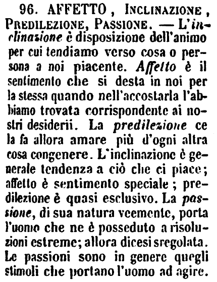 | Affetto, Inclinazione, Predilezione, Passione - L'inclinazione è disposizione dell'animo per cui tendiamo verso cosa o persona a noi piacente. Affetto è il sentimento che si desta in noi per la stessa quando nell'accostarla l'abbiamo trovata corrispondente ai nostri desiderii. La predilezione ce la fa allora amare più d'ogni altra cosa congenere. L'inclinazione è generale tendenza a ciò che ci piace; affetto è sentimento speciale; predilezione è quasi esclusivo. La passione, di sua natura veemente, porta l'uomo che ne è posseduto a risoluzioni estreme; allora dicesi sregolata. Le passioni sono in genere quegli stimoli che portano l'uomo ad agire. [immagine] |