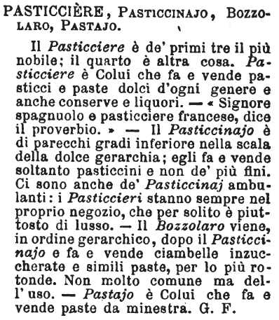 | Pasticciere, Pasticcinajo, Bozzolaro, Pastajo - Il Pasticciere è de' primi tre il più nobile; il quarto è altra cosa. Pasticciere è Colui che fa e vende pasticci e paste dolci d'ogni genere e anche conserve e liquori. - «Signore spagnuolo e pasticciere francese, dice il proverbio.» - Il Pasticcinajo è di parecchi gradi inferiore nella scala della dolce gerarchia; egli fa e vende soltanto pasticcini e non de' più fini. Ci sono anche de' Pasticcinaj ambulanti: i Pasticcieri stanno sempre nel proprio negozio, che per solito è piuttosto di lusso. - Il Bozzolaro viene, in ordine gerarchico, dopo il Pasticcinajo e fa e vende ciambelle inzuccherate e simili paste, per lo più rotonde. Non molto comune ma dell'uso. - Pastajo è Colui che fa e vende paste da minestra. G. F. [immagine] |