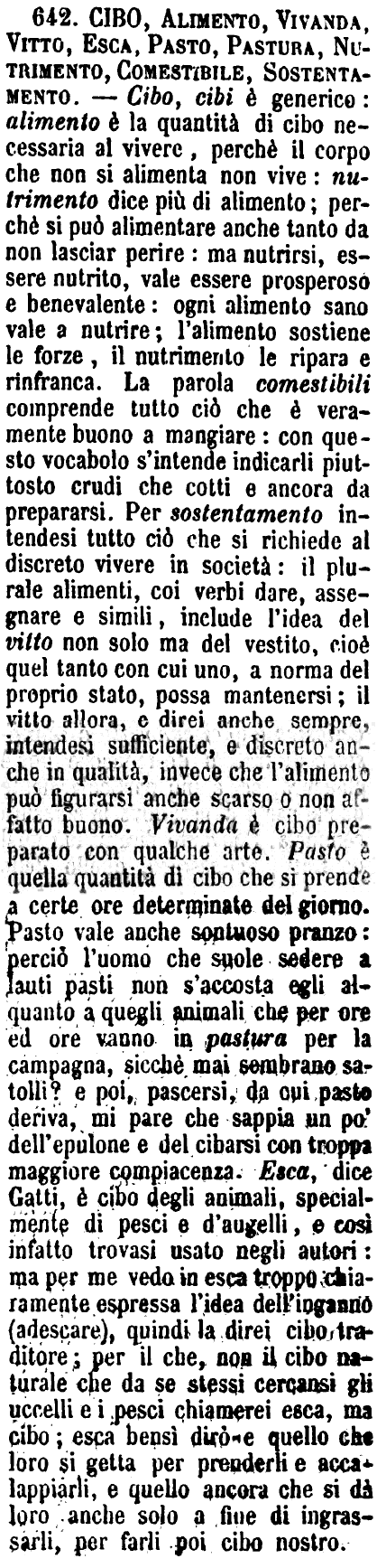 Cibo, Alimento, Vivanda, Vitto, Esca, Pasto, Pastura, Nutrimento, Comestibile, Sostentamento - Cibo, cibi è generico: alimento è la quantità di cibo necessaria al vivere, perchè il corpo che non si alimenta non vive: nutrimento dice più di alimento; perchè si può alimentare anche tanto da non lasciar perire: ma nutrirsi, essere nutrito, vale essere prosperoso e benevalente: ogni alimento sano vale a nutrire; l'alimento sostiene le forze, il nutrimento le ripara e rinfranca. La parola comestibili comprende tutto ciò che è veramente buono a mangiare: con questo vocabolo s'intende indicarli piuttosto crudi che cotti e ancora da prepararsi. Per sostentamento intendesi tutto ciò che si richiede al discreto vivere in società: il plurale alimenti, coi verbi dare, assegnare e simili, include l'idea del vitto non solo ma del vestito, cioè quel tanto con cui uno, a norma del proprio stato, possa mantenersi; il vitto allora, e direi anche sempre, intendesi sufficiente, e discreto anche in qualità, invece che l'alimento può figurarsi anche scarso o non affatto buono. Vivanda è cibo preparato con qualche arte. Pasto è quella quantità di cibo che si prende a certe ore determinate del giorno. Pasto vale anche sontuoso pranzo: perciò l'uomo che suole sedere a lauti pasti non s'accosta egli alquanto a quegli animali che per ore ed ore vanno in pastura per la campagna, sicchè mai sembrano satolli? e poi, pascersi, da cui pasto deriva, mi pare che sappia un po' dell'epulone e del cibarsi con troppa maggiore compiacenza. Esca, dice Gatti, è cibo degli animali, specialmente di pesci e d'augelli, e così infatto trovasi usato negli autori: ma per me vedo in esca troppo chiaramente espressa l'idea dell'inganno (adescare), quindi la direi cibo traditore; per il che, non il cibo naturale che da se stessi cercansi gli uccelli e i pesci chiamerei esca, ma cibo; esca bensì dirò e quello che loro si getta per prenderli e accalappiarli, e quello ancora che si dà loro anche solo a fine di ingrassarli, per farli poi cibo nostro. [immagine]