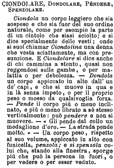 Ciondolare, Dondolare, Pendere, Spenzolare - Ciondola un corpo leggiero che sia sospeso e che sia fuor del suo ordine naturale, come per esempio la parte di un cintolo che siasi sciolto; e si dice specialmente delle vesti; onde si suol chiamar Ciondolina una donna che vesta sciattamente, ma con presunzione. E Ciondolare si dice anche di chi cammina a stento, quasi non reggendosi sulle gambe, o per malattia o per debolezza. — Dondola un corpo appiccato in alto dall'un de‘ capi, e che si muove in qua e in là senza impeto, o per il proprio peso o mosso da qualsivoglia forza. — Pende il corpo più o meno inclinato, e più o meno librato a sè stesso verticalmente: può pendere e non si muovere. — «Gli pende dal collo un medaglione d'oro. — La strada pende molto.» — Un corpo peso, rispetto al suo volume, appiccato in alto con funicella, penzola; e si spenzola colui che, stando alla flnestra, sporge più che può la persona in fuori, o per vedere o per esser veduto. [immagine]