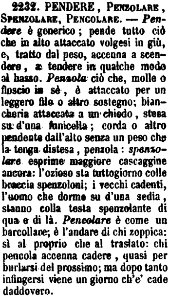 Pendere, Penzolare, Spenzolare, Pencolare - Pendere è generico; pende tutto ciò che in alto attaccato volgesi in giù, e, tratto dal peso, accenna a scendere, a tendere in qualche modo al basso. Penzola ciò che, molle o floscio in sè, è attaccato per un leggero filo o altro sostegno; biancheria attaccata a un chiodo, stesa su d'una funicella; corda o altro pendente dall'alto senza un peso che la tenga distesa, penzola: spenzolare esprime maggiore cascaggine ancora: l'ozioso sta tuttogiorno colle braccia spenzoloni; i vecchi cadenti, l'uomo che dorme su d'una sedia, stanno colla testa spenzolante di qua e di là. Pencolare è come un barcollare; è l'andare di chi zoppica: sì al proprio che al traslato: chi pencola accenna cadere, quasi per burlarsi del prossimo; ma dopo tanto infingersi viene un giorno ch'e' cade daddovero. [immagine]
