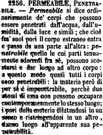 Permeabile, Penetrabile - Permeabile si dice ordinariamente de' corpi che possono essere penetrati dall'acqua, dall'umidità, dalla luce e simili; che cioè fra' suoi pori il corpo estraneo entra e passa da una parte all'altra: penetrabile quello le cui parti tenuamente aderenti fra sè, possono scostarsi e dar luogo ad altro corpo: a questo modo quasi tutti i corpi sono penetrabili: la materia però di per sè è impenetrabile, perchè due atomi di essa non possono occupare contemporaneamente lo stesso luogo; i pori della materia dilatandosi in un senso e ristringendosi in un altro, danno luogo all'apparente sua penetrabilità. [immagine]