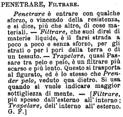 | Penetrare, Filtrare - Penetrare è entrare con qualche sforzo, o vincendo della resistenza, e si dice, più che altro, di cose materiali. - Filtrare, che suol dirsi di materie liquide, è il farsi strada a poco a poco e senza sforzo, per gli strati o per i pori della terra o di un tessuto. - Trapelare, quasi Passare tra pelo e pelo, è un filtrare più scarso e più lento. Questo si trasporta al figurato, ed è lo stesso che Prender pelo, veduto qua dietro. Si usa quando si vuole indicare maggior sottigliezza di mente. - [Filtrare, più spesso dall'esterno all'interno; Trapelare, dell'interno all'esterno. G. F.] [immagine] |