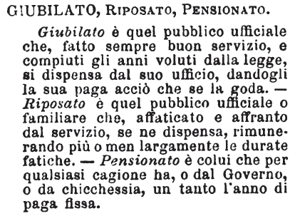 Giubilato, Riposato, Pensionato - Giubilato è quel pubblico ufficiale che, fatto sempre buon servizio, e compiuti gli anni voluti dalla legge, si dispensa dal suo ufficio, dandogli la sua paga acciò che se la goda. - Riposato è quel pubblico ufficiale o familiare che, affaticato e affranto dal servizio, se ne dispensa, rimunerando più o men largamente le durate fatiche. - Pensionato è colui che per qualsiasi cagione ha, o dal Governo, o da chicchessia, un tanto l'anno di paga fissa. [immagine]