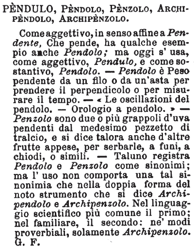 Pendulo, Pendolo, Penzolo, Archipendolo, Archipenzolo - Come aggettivo, in senso affine a Pendente, Che pende, ha qualche esempio anche Pendolo; ma oggi s' usa, come aggettivo, Pendulo, e come sostantivo, Pendolo. - Pendolo è Peso pendente da un filo o da un'asta per prendere il perpendicolo o per misurare il tempo. - «Le oscillazioni del pendolo. - Orologio a pendolo.» - Penzolo sono due o più grappoli d'uva pendenti dal medesimo pezzetto di tralcio, e si dice talora anche d'altre frutte appese, per serbarle, a funi, a chiodi, o simili. - Taluno registra Pendolo e Penzolo come sinonimi; ma l'uso non comporta una tal sinonimia che nella doppia forma del noto strumento che si dice Archipendolo e Archipenzolo. Nel linguaggio scientifico più comune il primo; nel familiare, il secondo: ne' modi proverbiali, solamente Archipenzolo. G. F. [immagine]