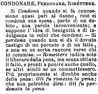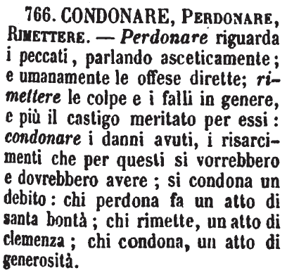 | Condonare, Perdonare, Rimettere - Perdonare riguarda i peccati, parlando asceticamente; e umanamente le offese dirette; rimettere le colpe e i falli in genere, e più il castigo meritato per essi: condonare i danni avuti, i risarcimenti che per questi si vorrebbero e dovrebbero avere; si condona un debito: chi perdona fa un atto di santa bontà; chi rimette, un atto di clemenza; chi condona, un atto di generosità. [immagine] |