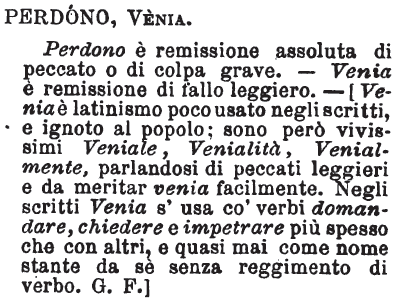 | Perdono, Venia - Perdono è remissione assoluta di peccato o di colpa grave. - Venia è remissione di fallo leggiero. - [Venia è latinismo poco usato negli scritti, e ignoto al popolo; sono però vivissimi, Veniale, Venialità, Venialmente, parlandosi di peccati leggieri e da meritar Venia facilmente. Negli scritti Venia s'usa co' verbi domandare, chiedere e impetrare più spesso che con altri, e quasi mai come nome stante da sè senza reggimento di verbo. G. F.] [immagine] |