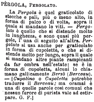 Pergola, Pergolato - La Pergola è quel graticolato di stecche e pali, più o meno alto, in forma di palco o di volta, sopra il quale si mandano le viti. - Pergolato è quello che si distende molto in lunghezza, e sono quasi più pergole, l'una di seguito all'altra. Pergolato si usa anche per graticolato in forma di cupolette, o che si distende molto per lungo, sopra il quale si mandano altre piante rampicanti da far ombra nell'estate; se è in forma di cupoletta, alcuni lo chiamano gallicamente Bersò (Berceau). - [Cupolino o Cupoletta potrebbe tradurre il Berceau; ma oramai è una di quelle parole così comuni che nessun furore di purista vale ad estirpare. G. F.] [immagine]