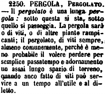Pergola, Pergolato - Il pergolato è una lunga pergola: sotto questa si sta, sotto quello si passeggia. La pergola sarà o di viti, o di altre piante rampicanti; il pergolato, di viti sempre, almeno comunemente, perché è meno probabile il volere perdere per semplice passatempo e adornamento un assai lungo spazio di terreno, quando anco fatto di viti può servire a un tempo all'utile e al diletto. [immagine]