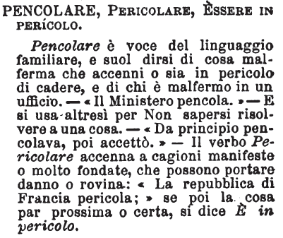 | Pencolare, Pericolare, Essere in pericolo - Pencolare è voce del linguaggio familiare, e suol dirsi di cosa malferma che accenni o sia in pericolo di cadere, e di chi è malfermo in un ufficio. - «Il Ministero pencola.» - E si usa altresì per Non sapersi risolvere a una cosa. - «Da principio pencolava, poi accettò.» - Il verbo Pericolare accenna a cagioni manifeste o molto fondate, che possono portare danno o rovina: «La repubblica di Francia pericola;» se poi la cosa par prossima o certa, si dice E' in pericolo. [immagine] |