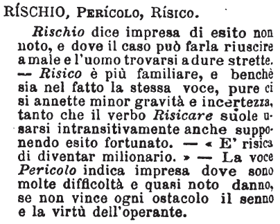 | Rischio, Pericolo, Risico - Rischio dice impresa di esito non noto, e dove il caso può farla riuscire a male e l'uomo trovarsi a dure strette. - Risico è più familiare, e benchè sia nel fatto la stessa voce, pure ci si annette minor gravità e incertezza, tanto che il verbo Risicare suole usarsi intransitivamente anche supponendo esito fortunato. - «E' risica di diventar milionario.» - La voce Pericolo indica impresa dove sono molte difficoltà e quasi noto danno, se non vince ogni ostacolo il senno e la virtù dell'operante. [immagine] |