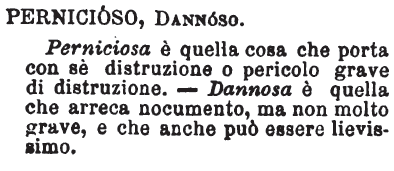 | Pernicioso, Dannoso - Perniciosa è quella cosa che porta con sè distruzione o pericolo grave di distruzione. - Dannosa è quella che arreca nocumento, ma non molto grave, e che anche può essere lievissimo. [immagine] |